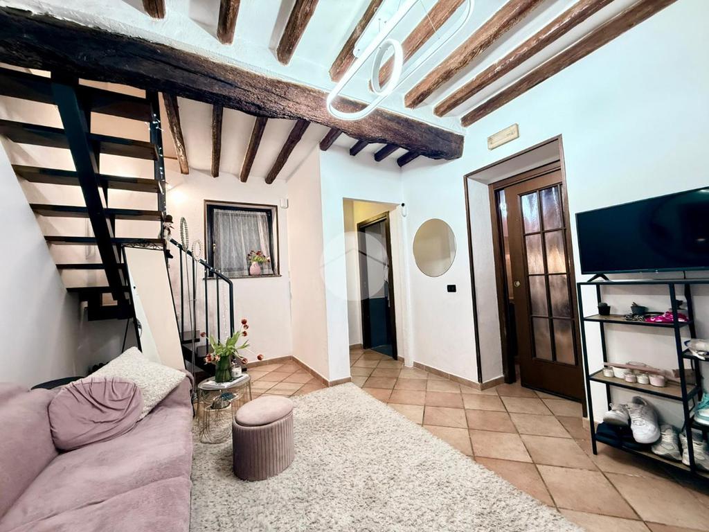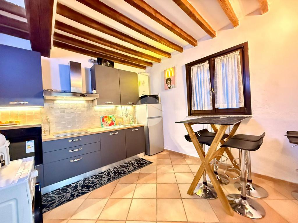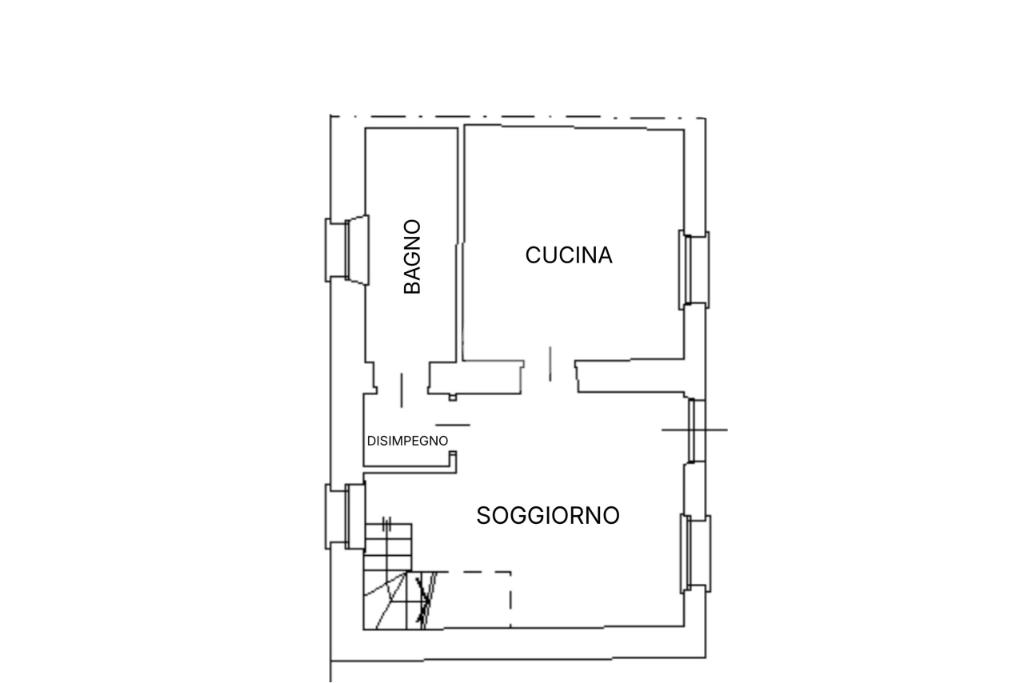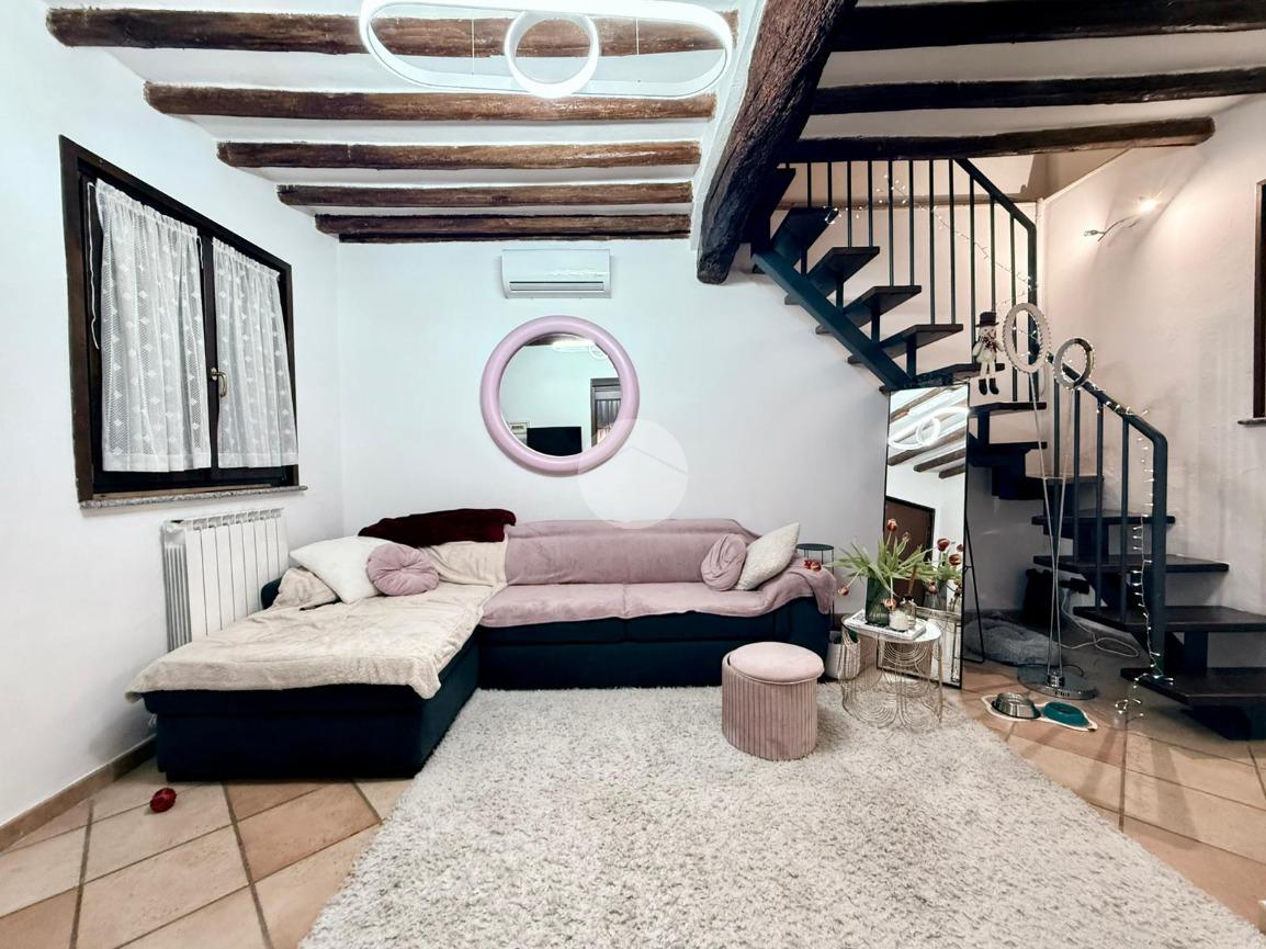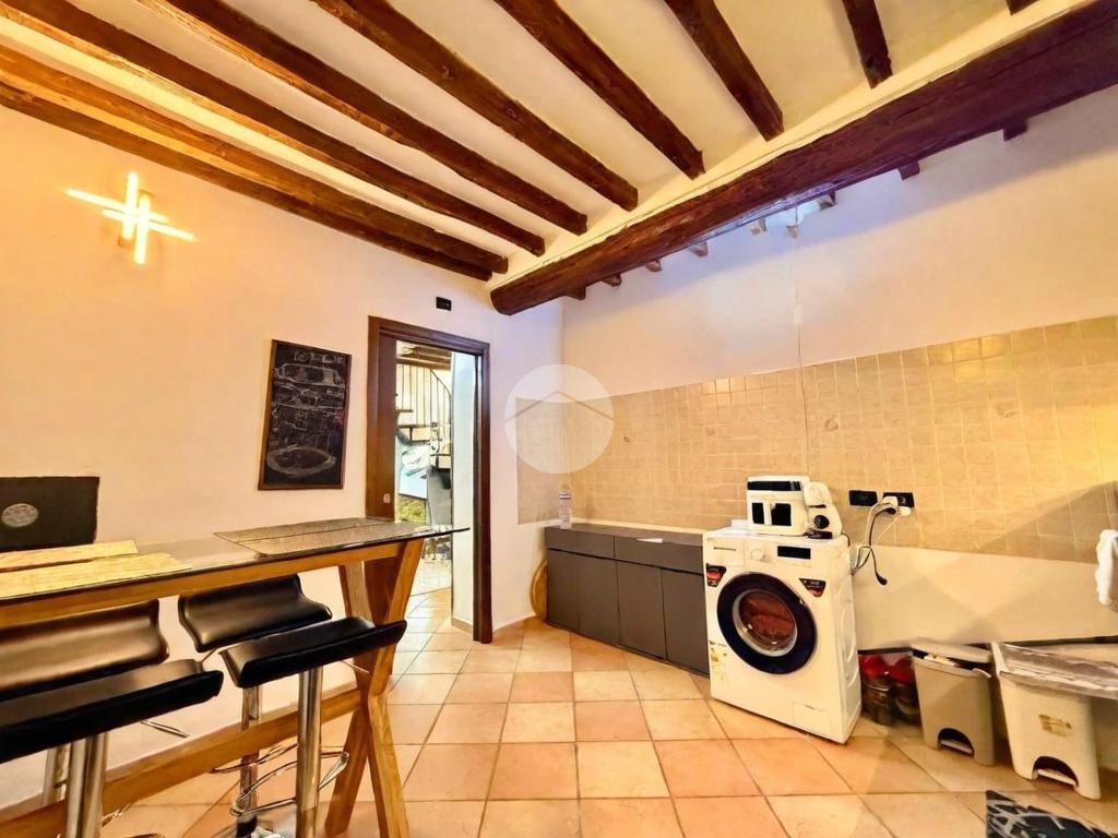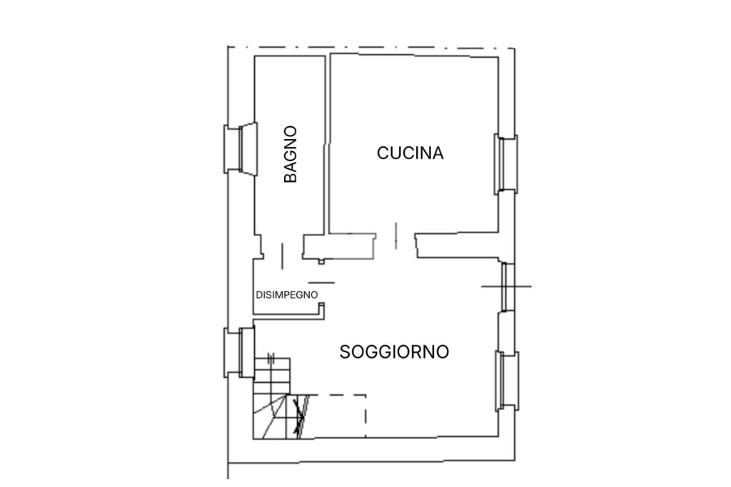 L’ingresso al piano terra conduce direttamente al soggiorno, ambiente accogliente e ben organizzato che rappresenta il cuore della casa. Da qui si accede alla cucina separata, funzionale e ben sfruttabile, mentre tramite un piccolo disimpegno si raggiunge il bagno finestrato, completo di box doccia.