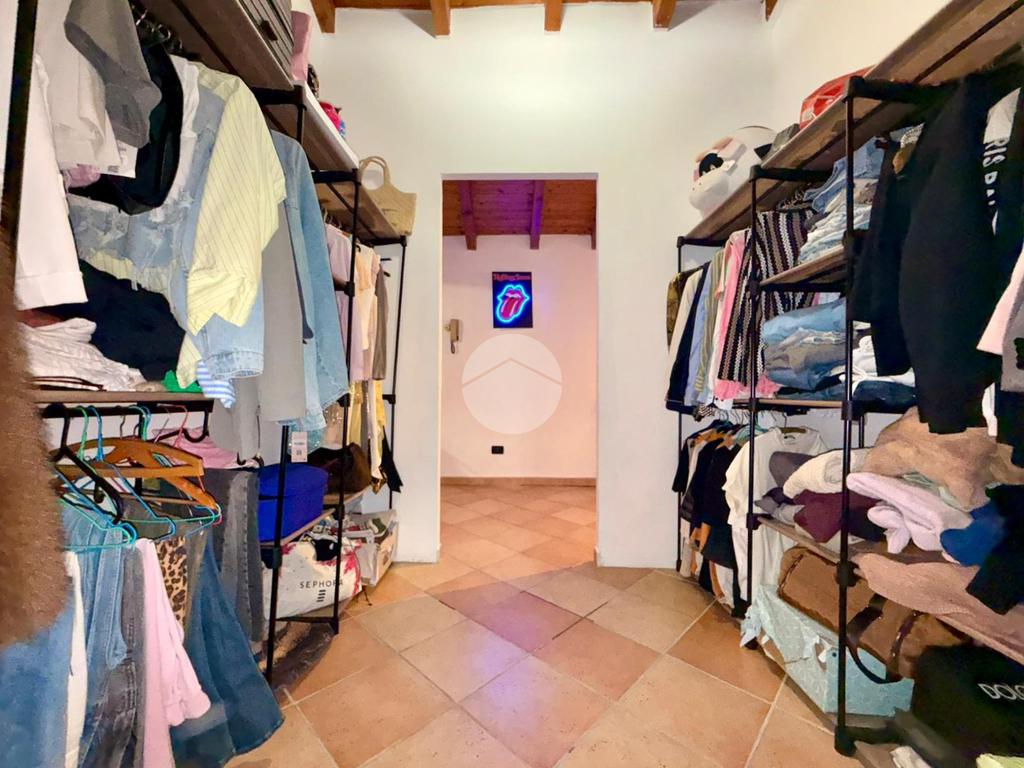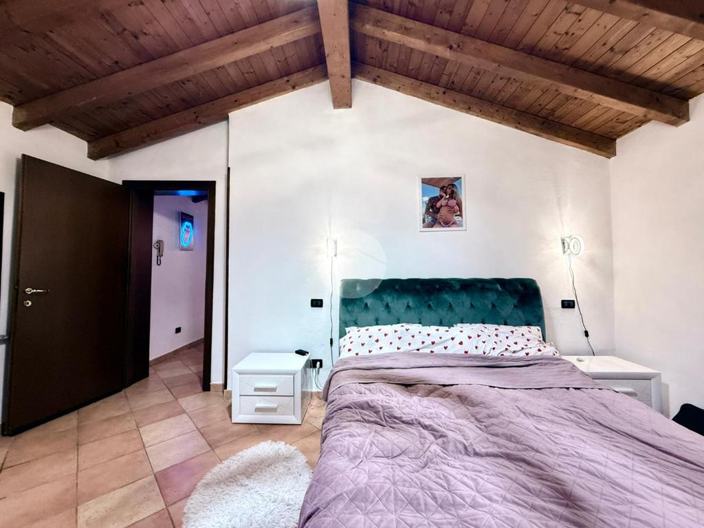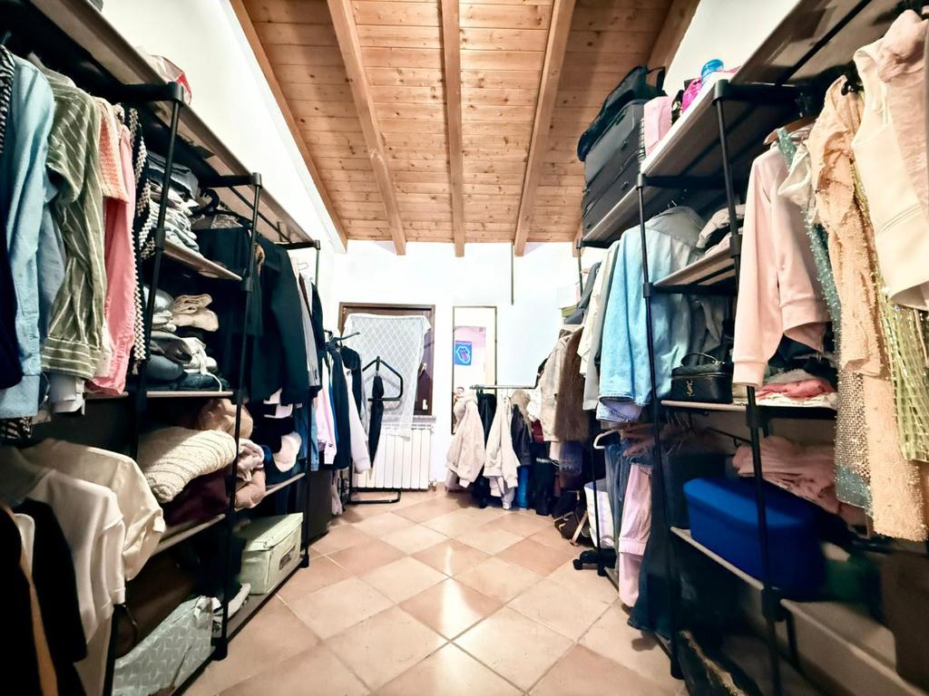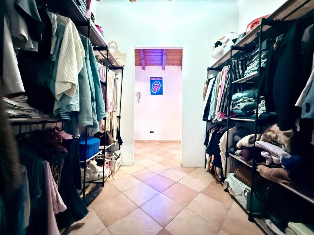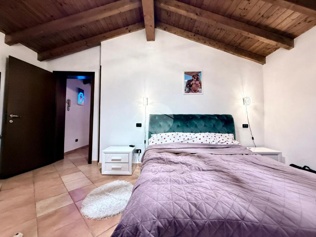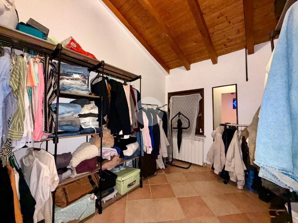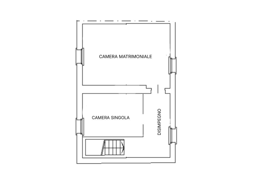 Una scala interna posta nel soggiorno conduce al piano superiore, dove si sviluppa la zona notte composta da due camere da letto: una camera singola, attualmente adibita a cabina armadio, e una spaziosa camera matrimoniale.