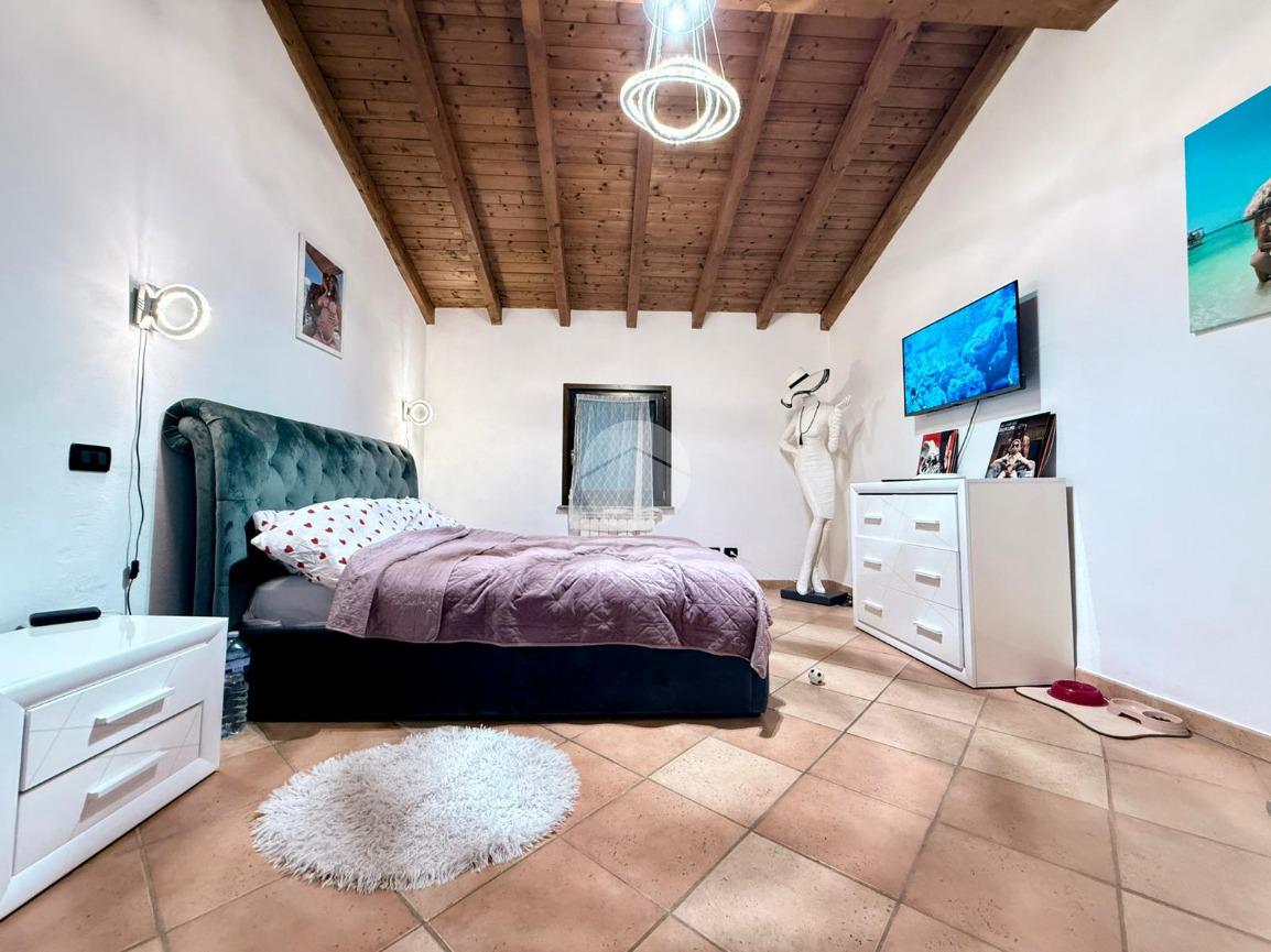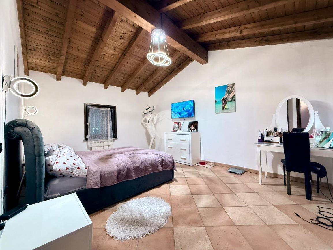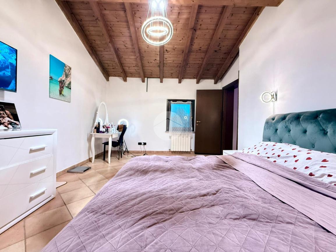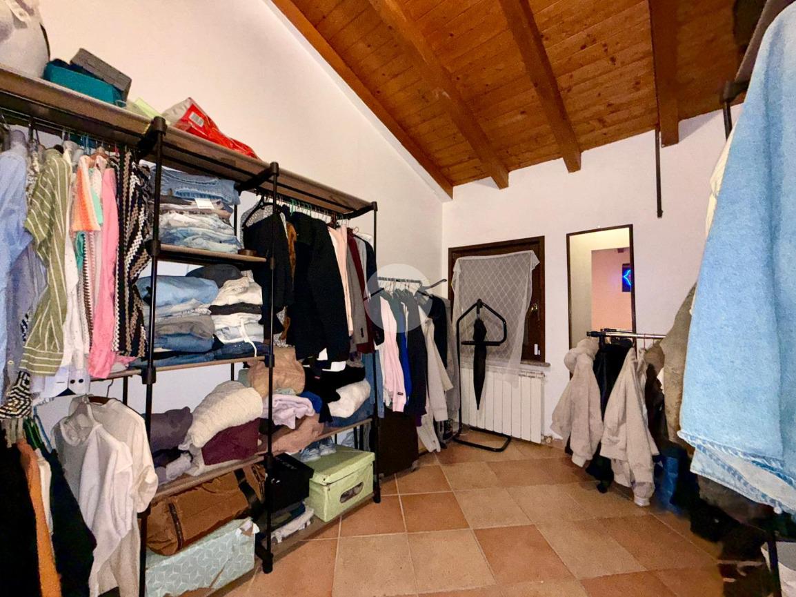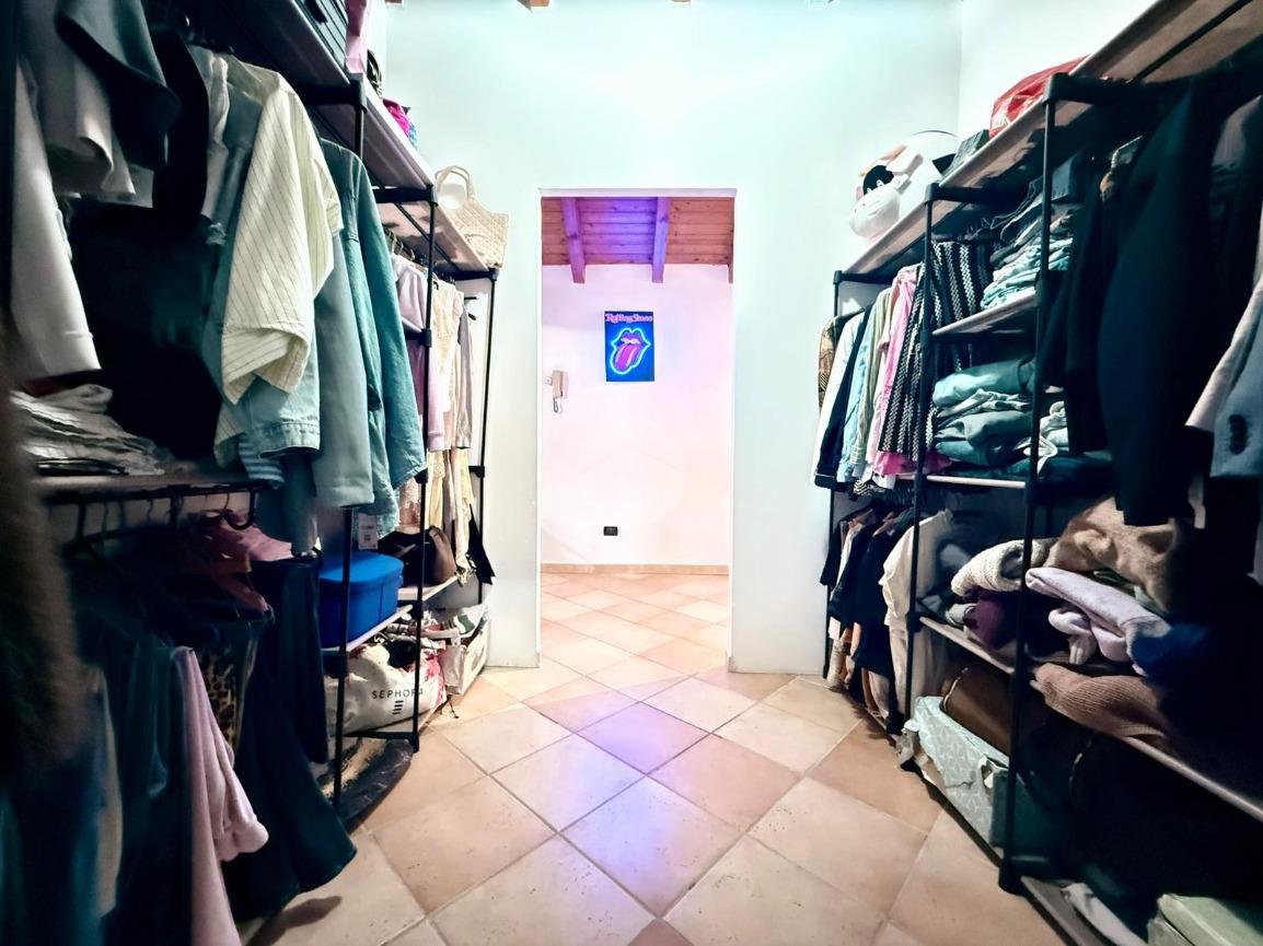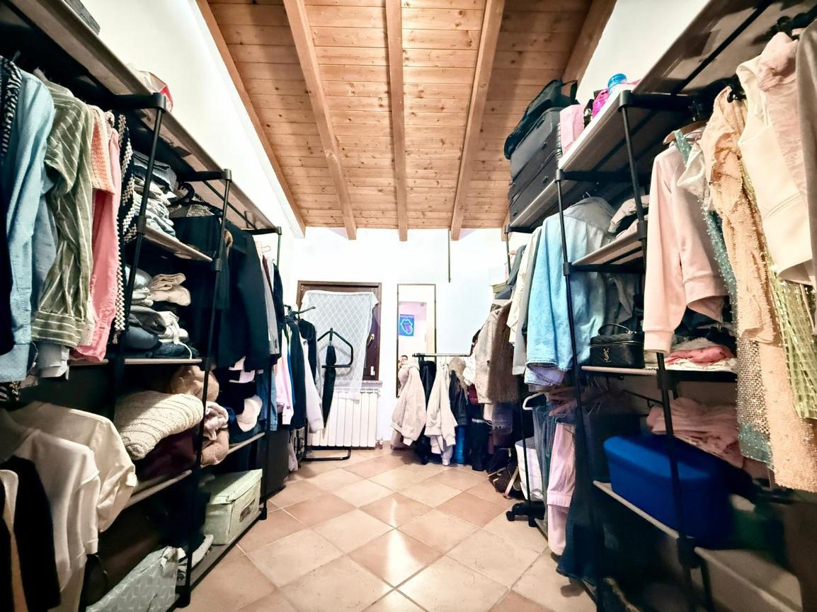 Una scala interna posta nel soggiorno conduce al piano superiore, dove si sviluppa la zona notte composta da due camere da letto: una camera singola, attualmente adibita a cabina armadio, e una spaziosa camera matrimoniale.