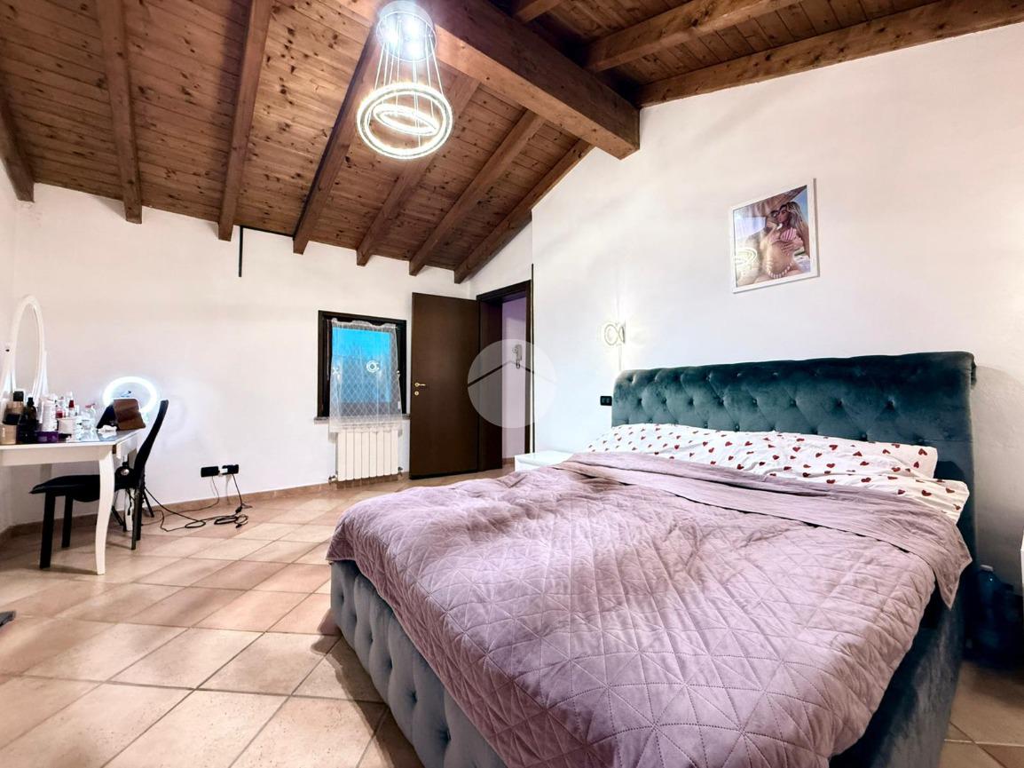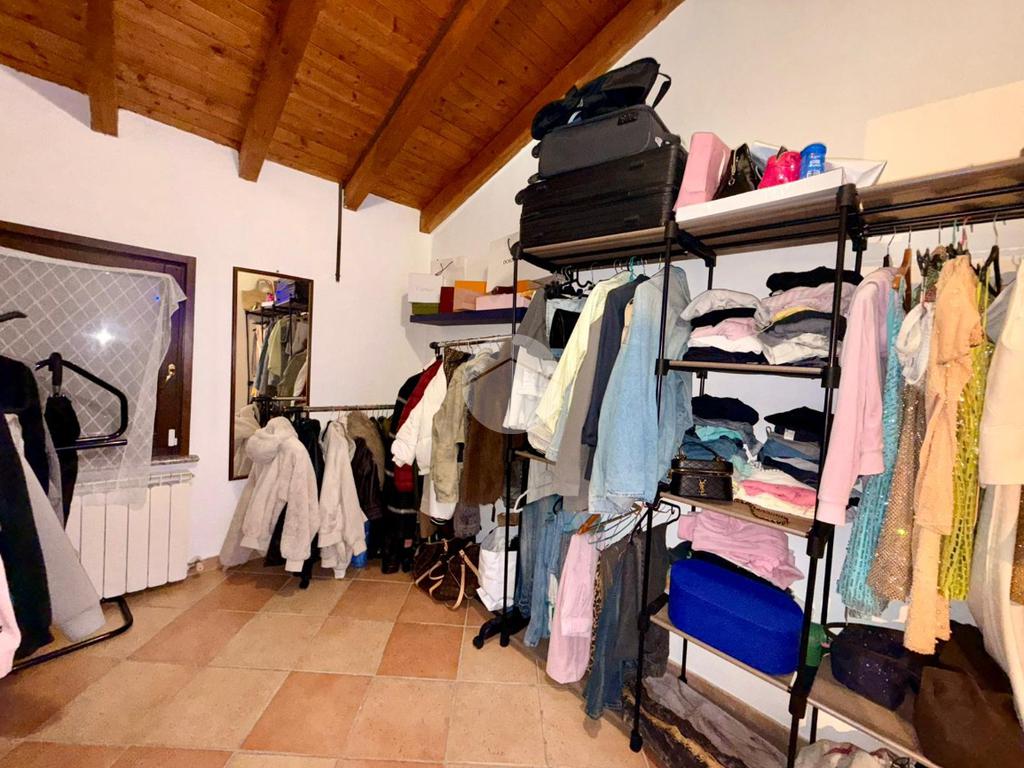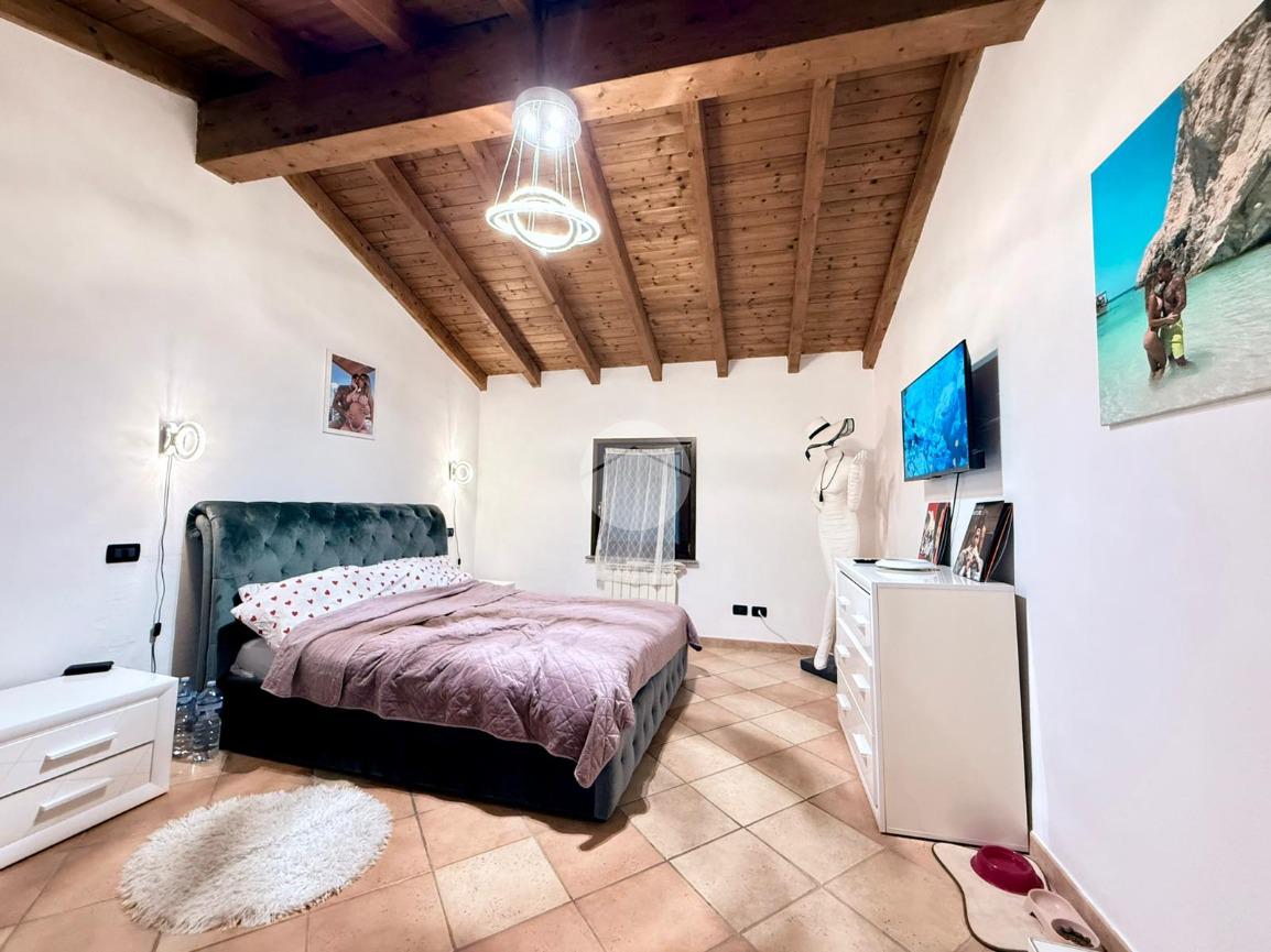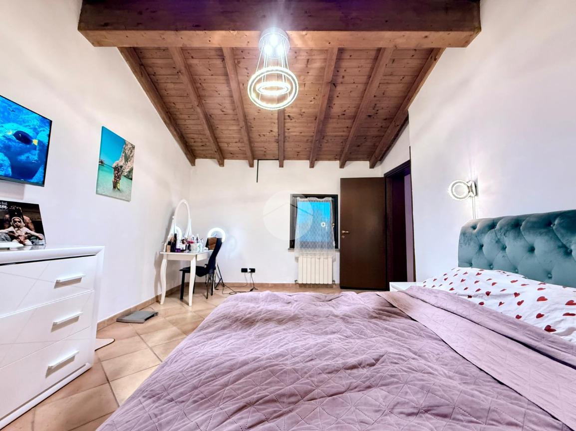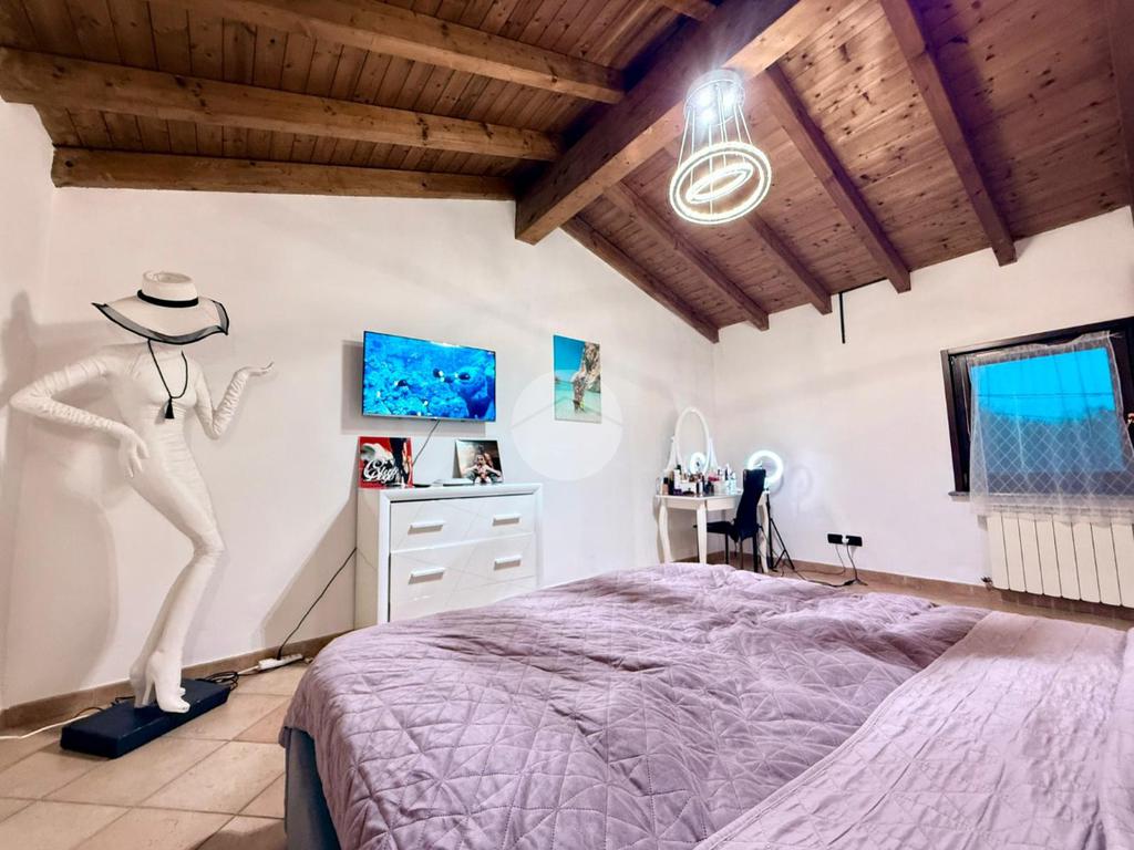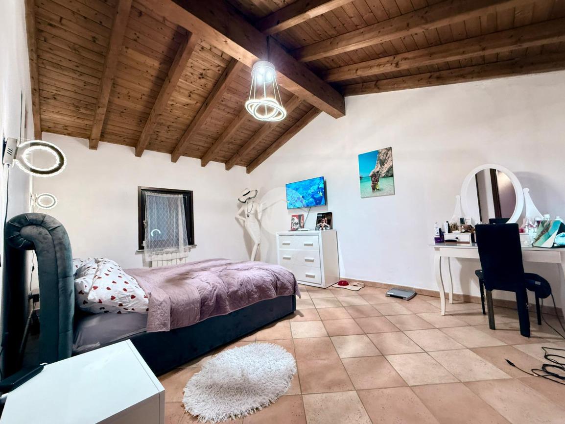Una scala interna posta nel soggiorno conduce al piano superiore, dove si sviluppa la zona notte composta da due camere da letto: una camera singola, attualmente adibita a cabina armadio, e una spaziosa camera matrimoniale.